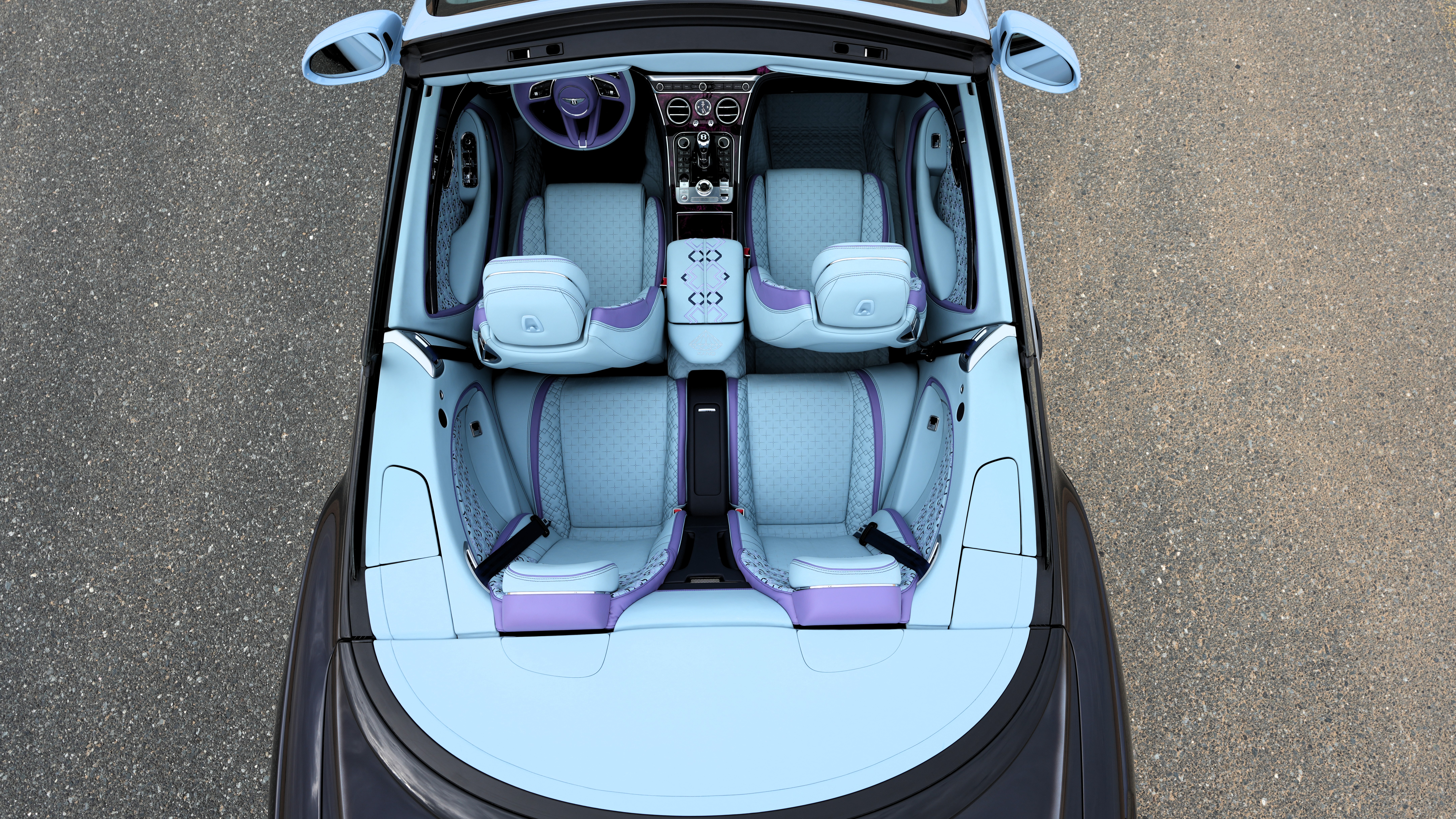- Complete Refined Interior by Exclusive Leather Sorts Seats in Baby Blue with Iris Purple and Beluga Blue stitching matched with Onyx Emblem